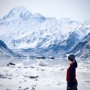 雪山下的徒步者与小湖