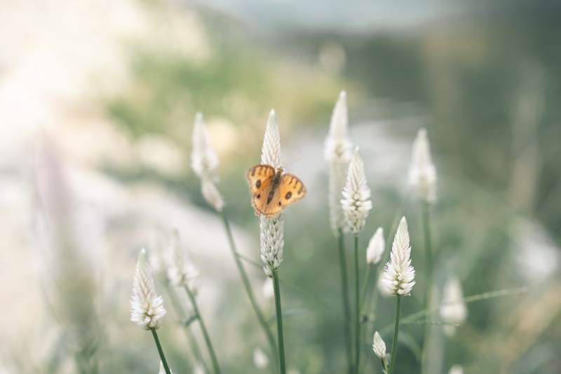 蝴蝶栖息在白色花朵上
