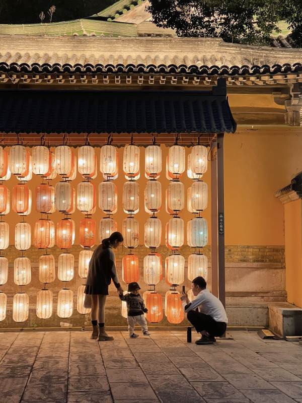 夜幕下的灯笼墙与家庭时光
