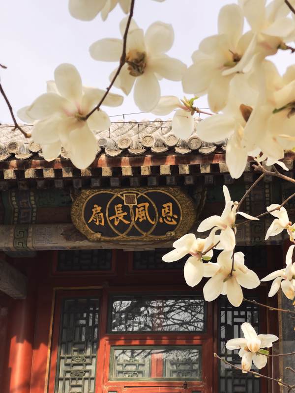 古建筑前的玉兰花