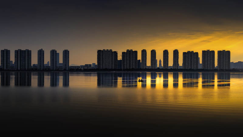 夕阳下的城市倒影