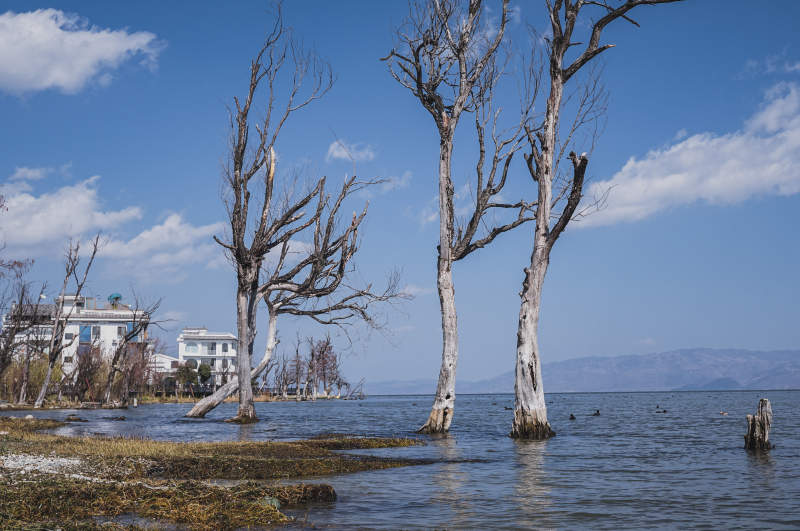 湖畔枯树与蓝天