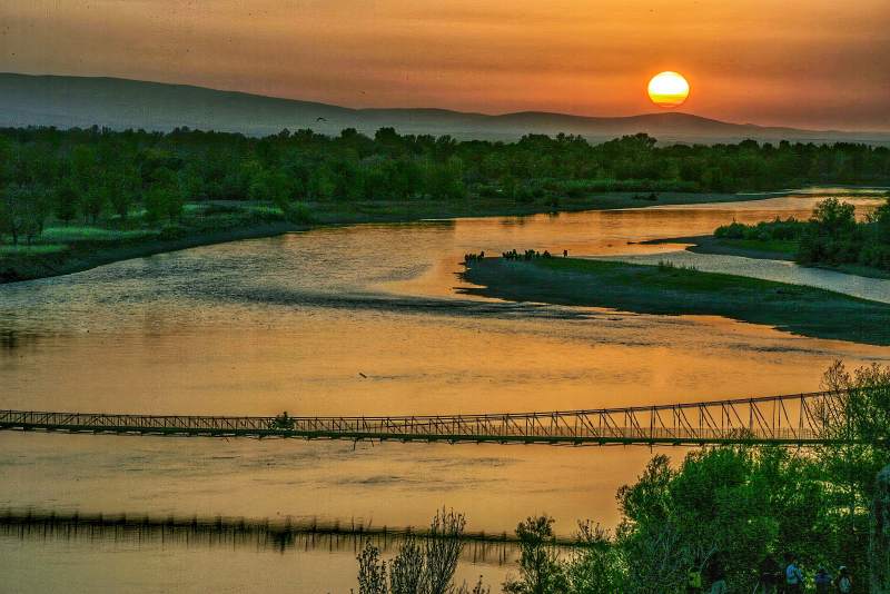 夕阳下的河上悬索桥