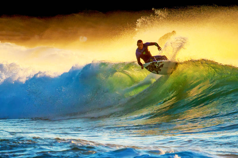 冲浪者在金色夕阳下