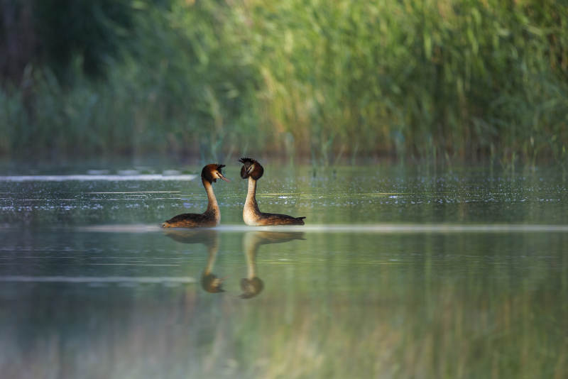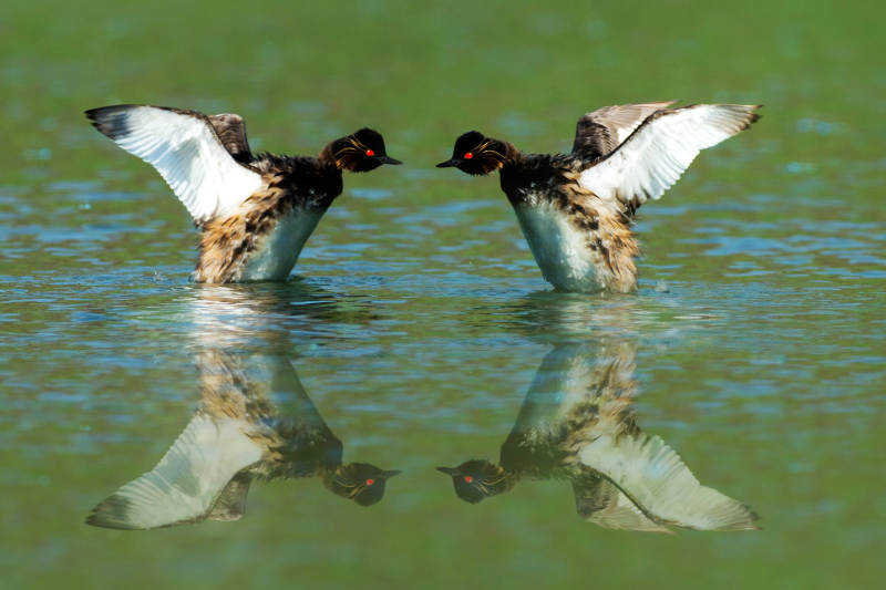 黑颈䴙䴘展翅对视