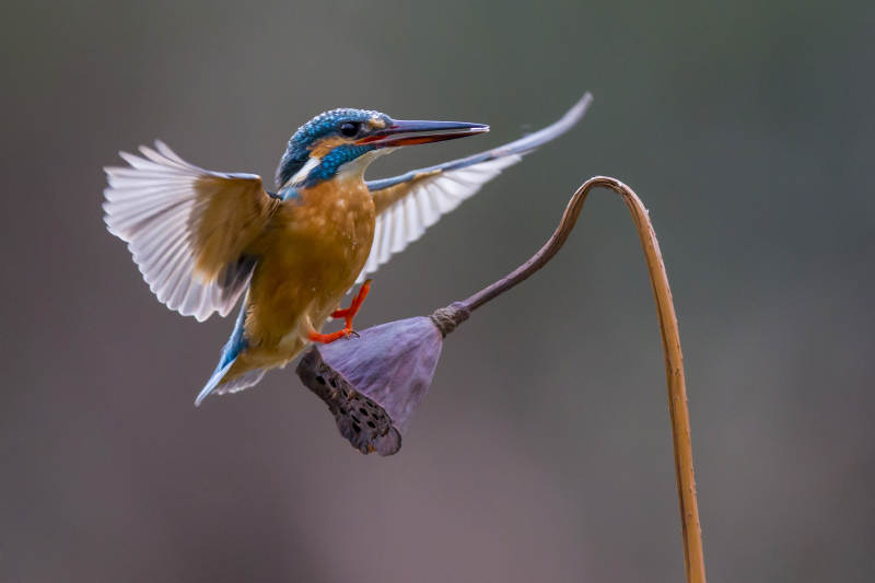 翠鸟展翅 莲蓬为伴