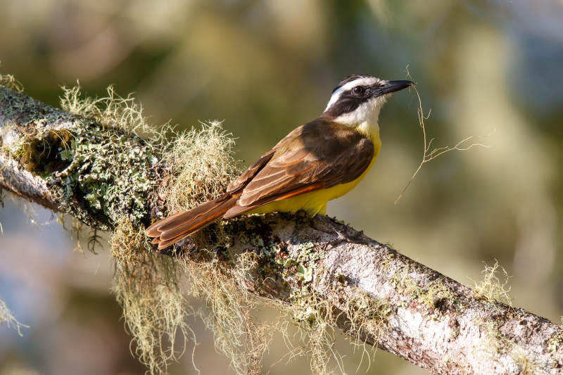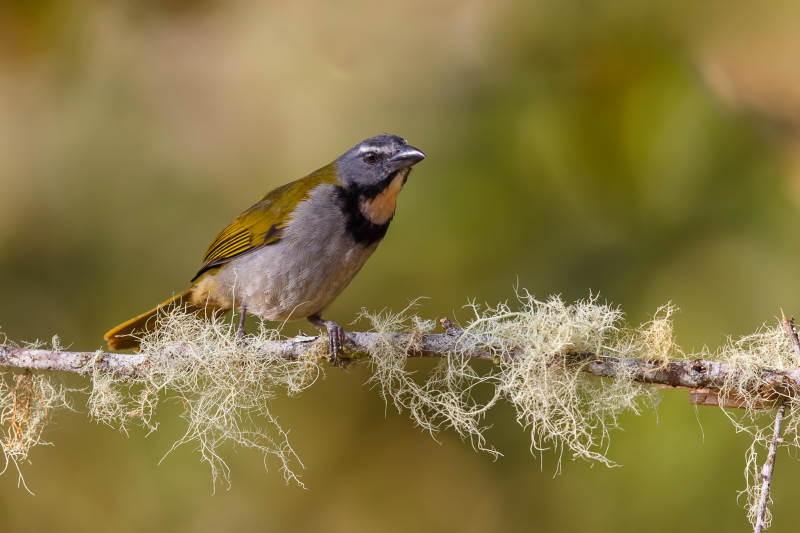 黄喉舞雀栖息在苔藓树枝上