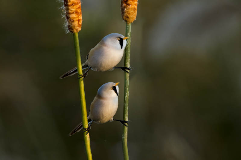 两只文须雀栖息在芦苇上