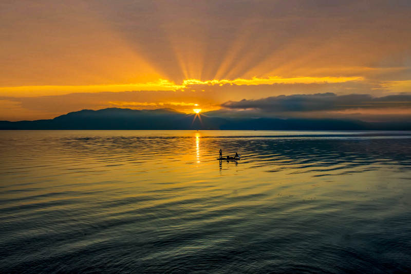湖上日落独木舟