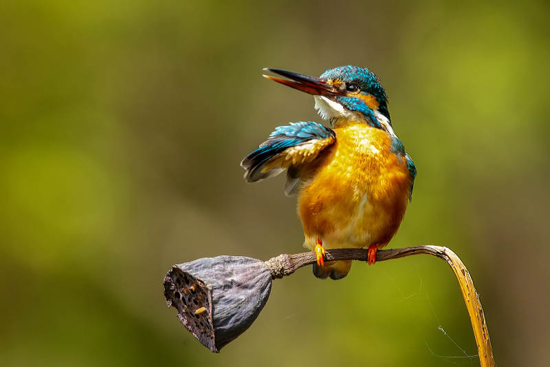 翠鸟栖息莲蓬上