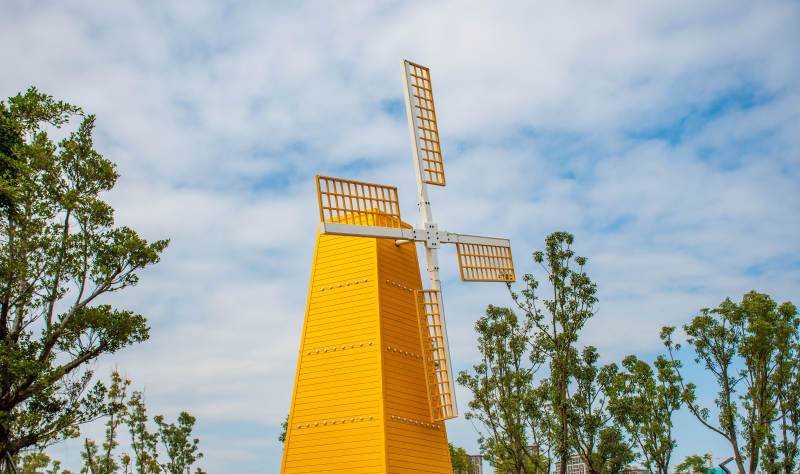 黄色风车在蓝天白云下
