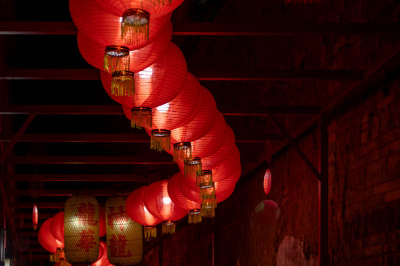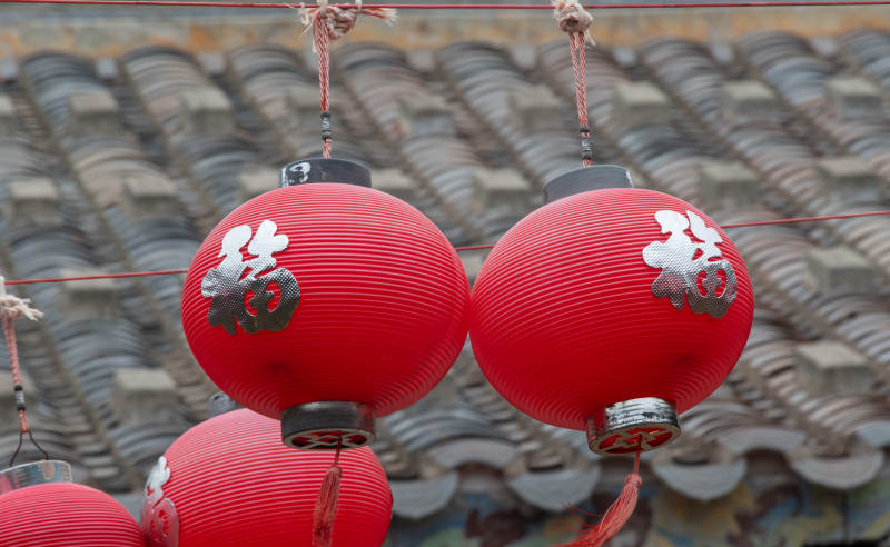 红灯笼高挂屋顶前