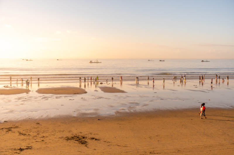 东山岛夕阳下的海滩与人群