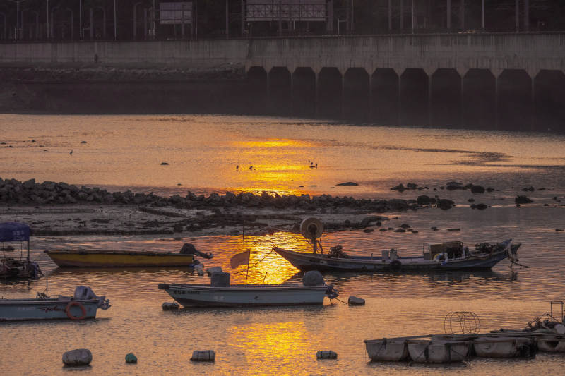 夕阳下的渔港静谧时光