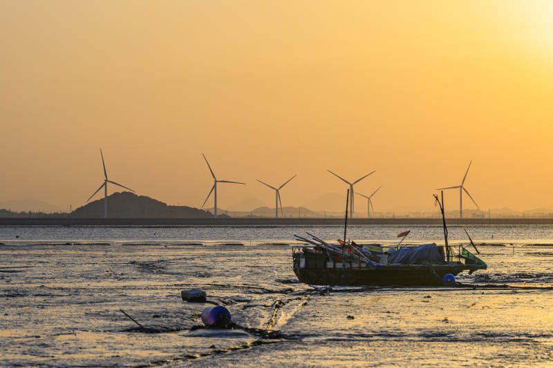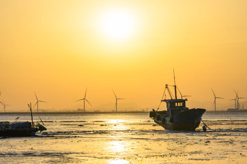 夕阳下的海上风车与渔船