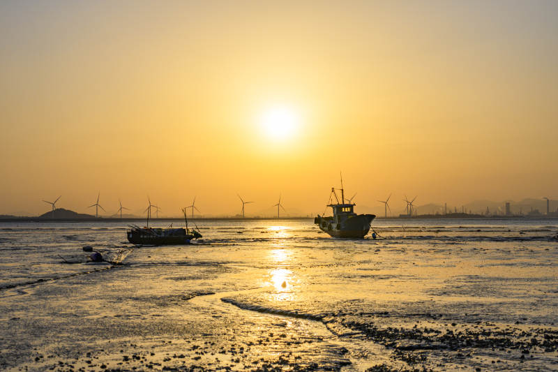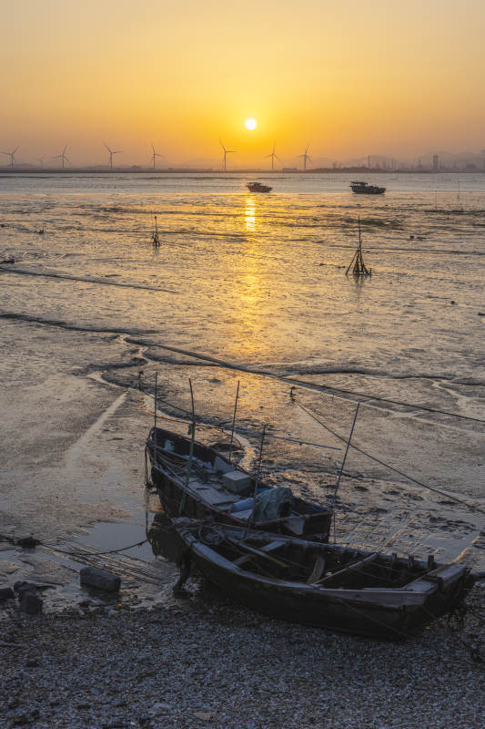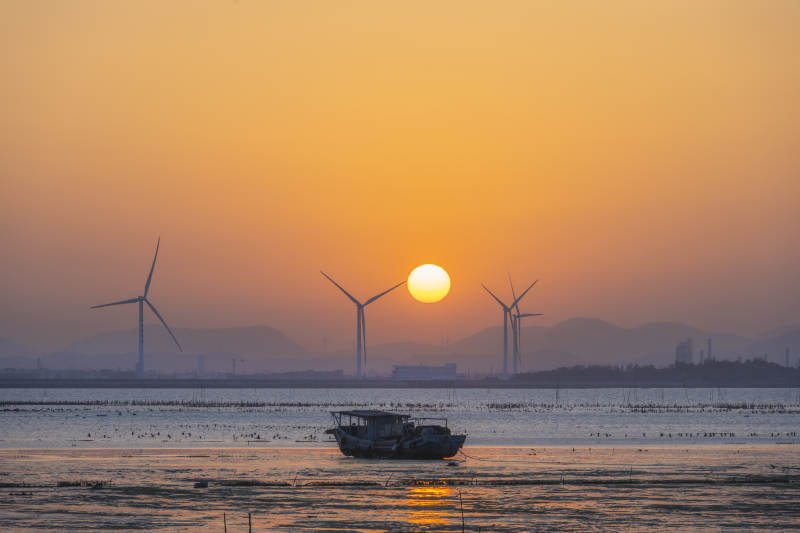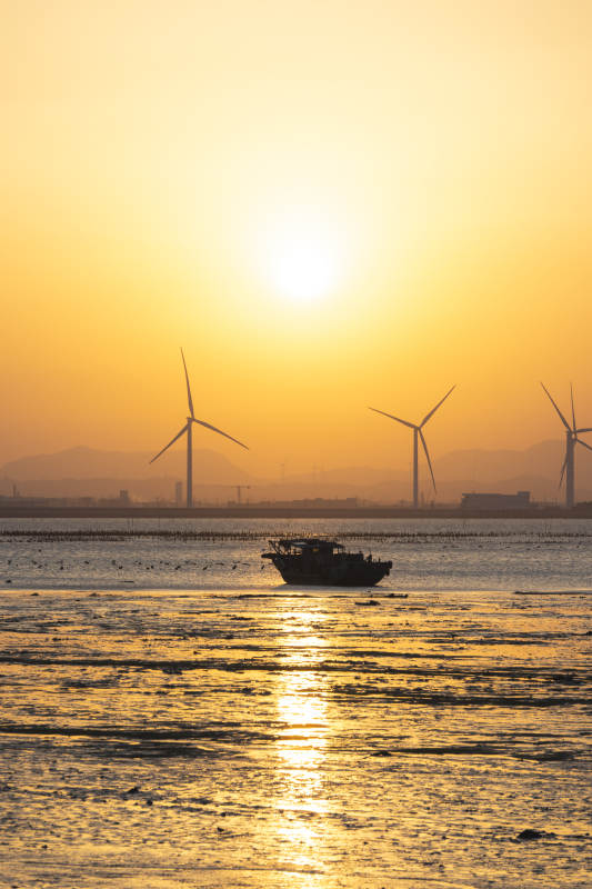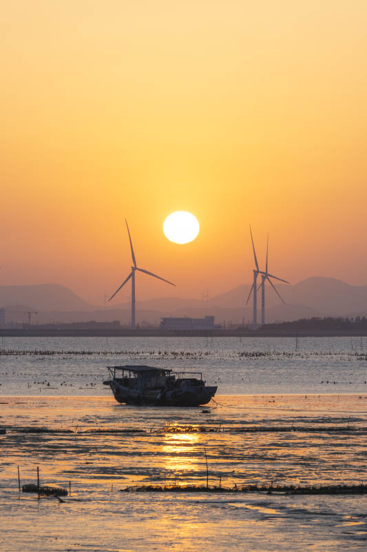 夕阳下的风车与渔船