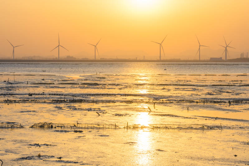 夕阳下的风车与海滩