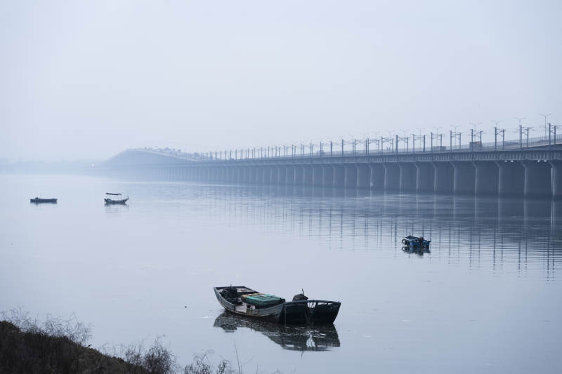 雾中江桥与孤舟