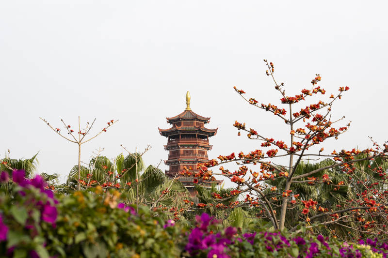 花开杏林阁塔前春意浓