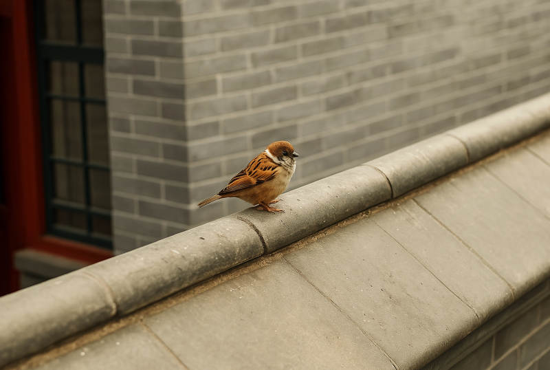 小鸟栖息在屋檐上