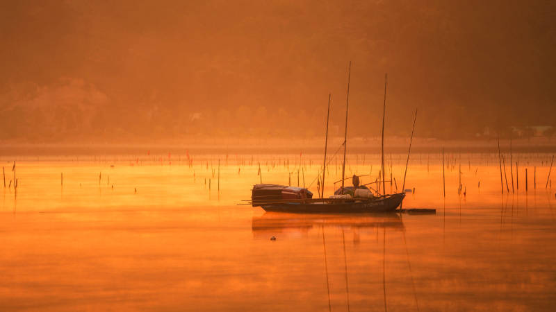 湖上孤舟夕阳映