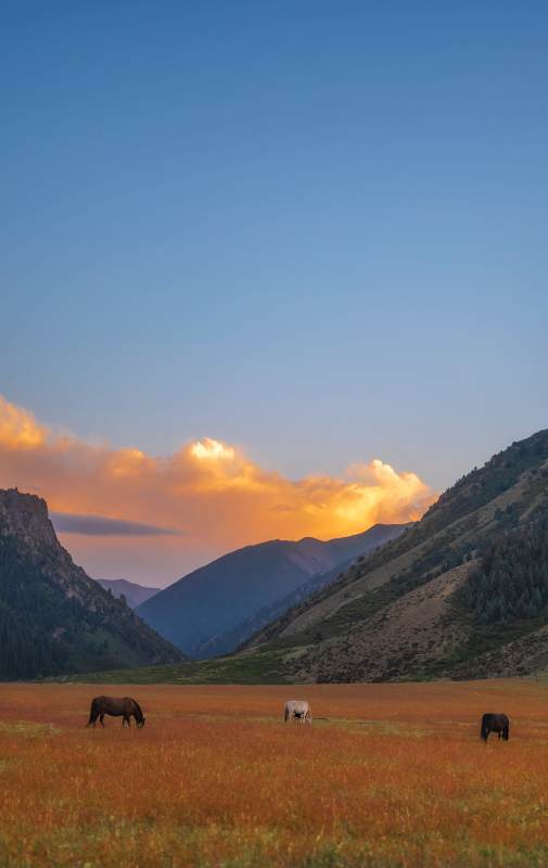 夕阳下的草原与马
