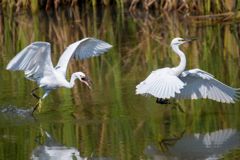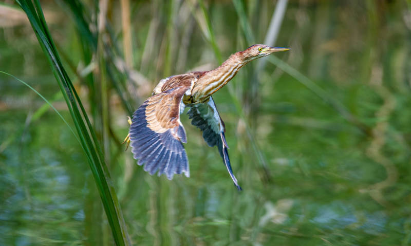 苇鳽展翅飞过水面