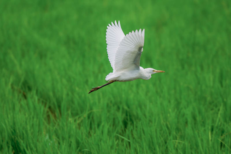 白鹭飞翔在绿野之上