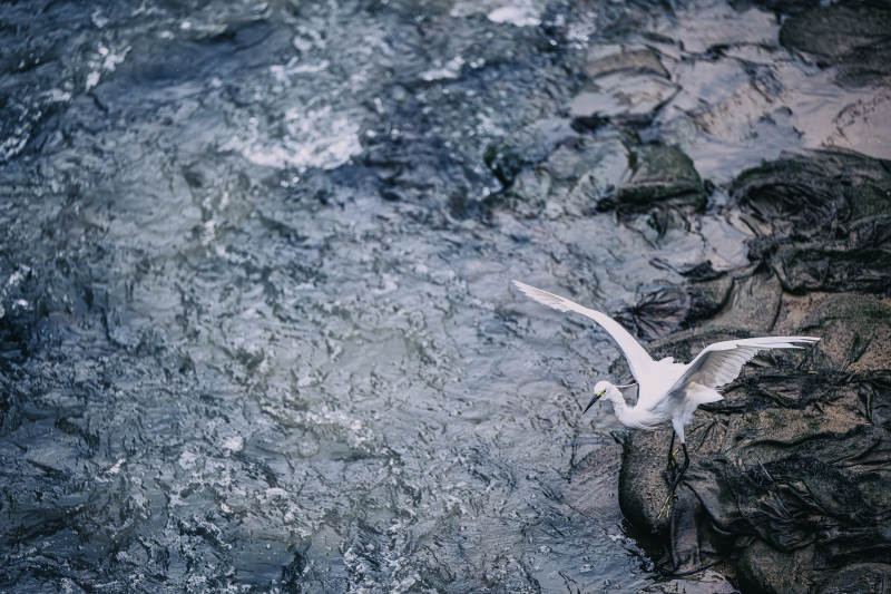 白鹭翱翔在岩石海岸