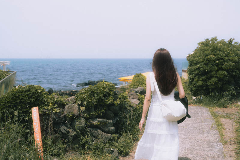 海边漫步的白衣女子