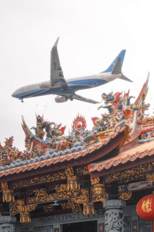 飞机飞越传统庙宇