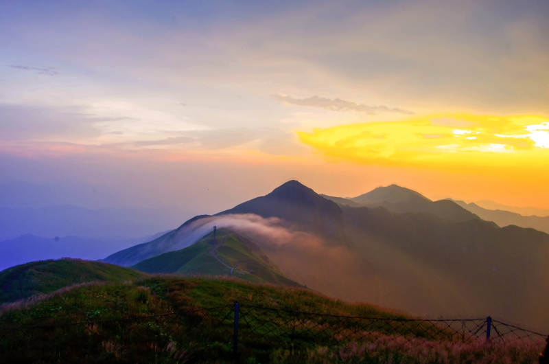 朝阳下的武功山绿色山脉