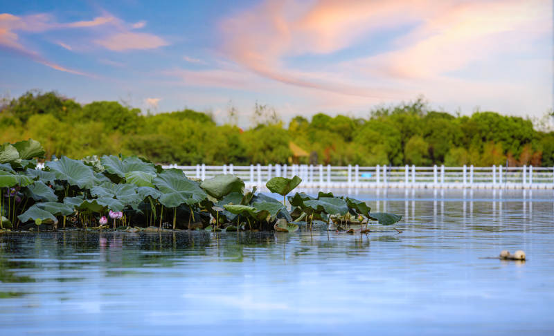 湖畔荷叶与天空倒影