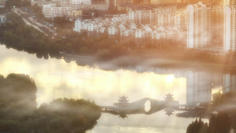 晨光中的城市与古桥