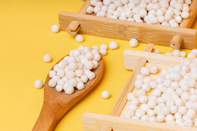 木勺与竹盘上的西米谷物
