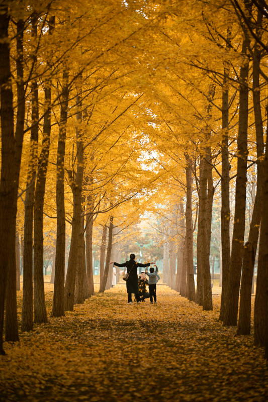 秋日林荫下的亲子时光