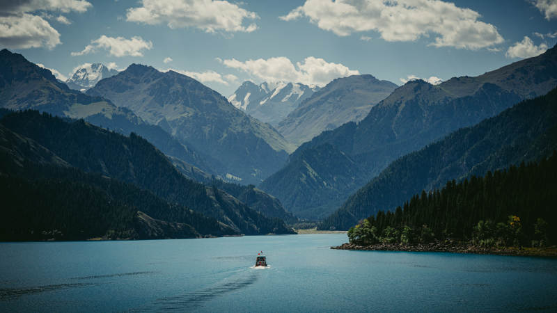 高山湖泊游船图