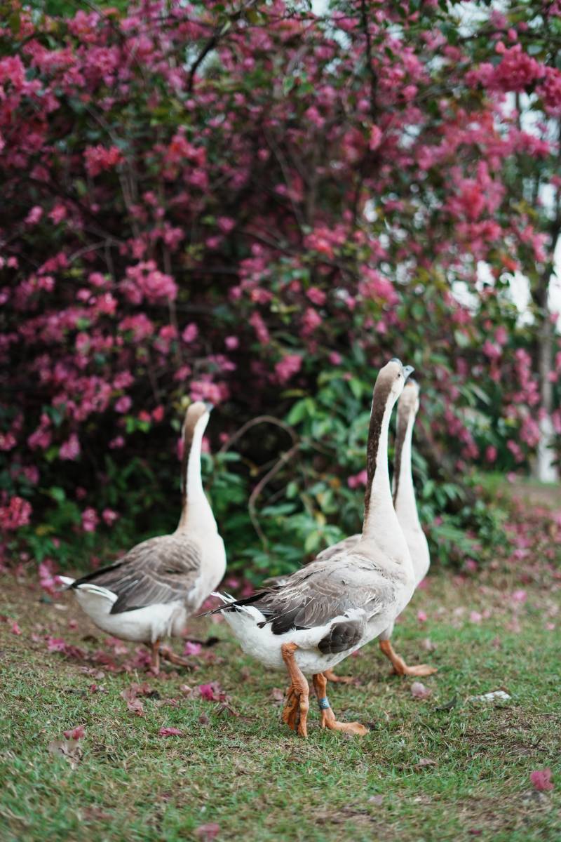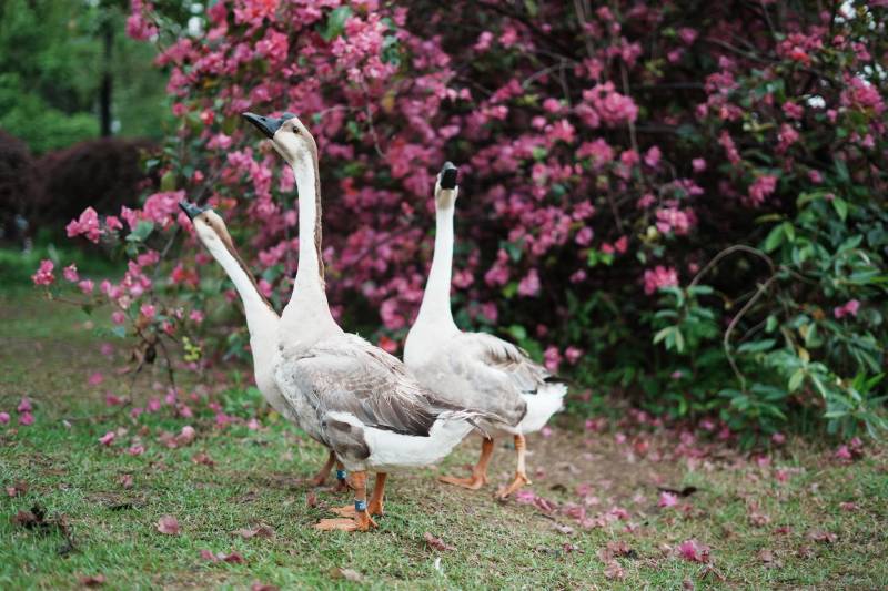 鹅游花间