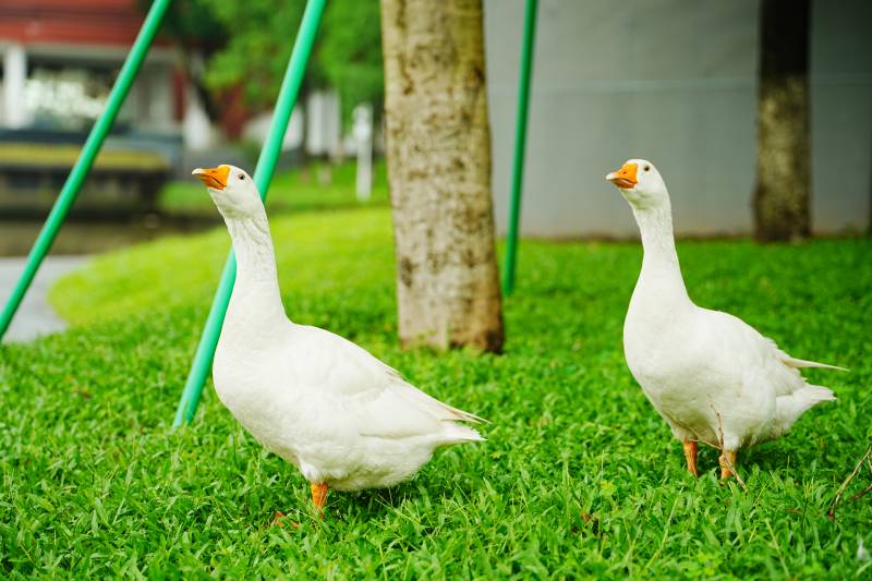 两只白鹅在草地上