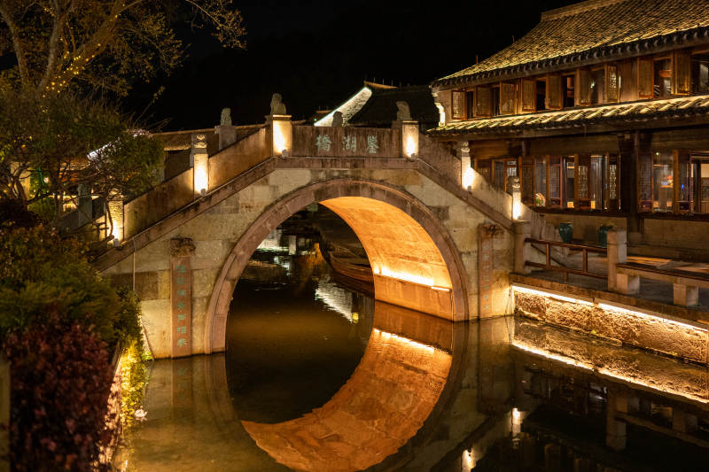 夜色古桥映水中