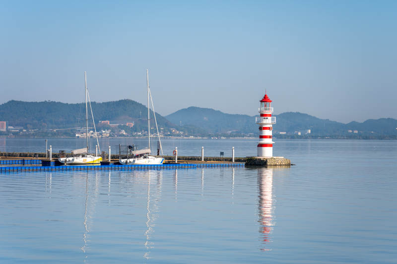 宁静海港灯塔与帆船