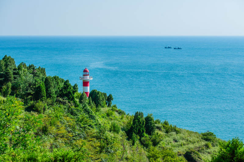 海岸灯塔与绿树