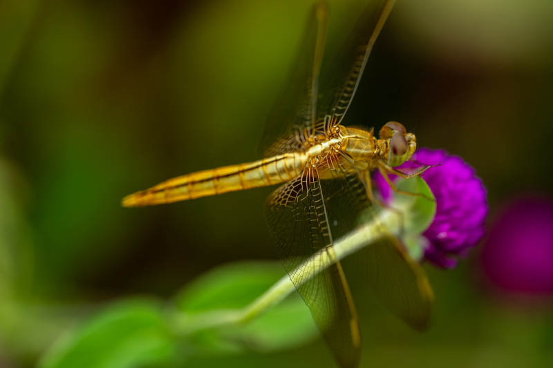 金色蜻蜓栖息紫色花