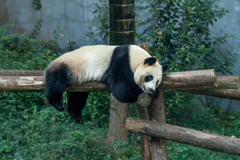 熊猫悠闲卧木栏