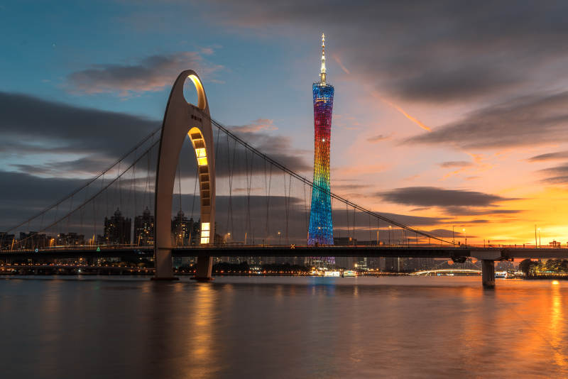 广州珠江畔广州塔与猎德大桥的晚霞黄昏