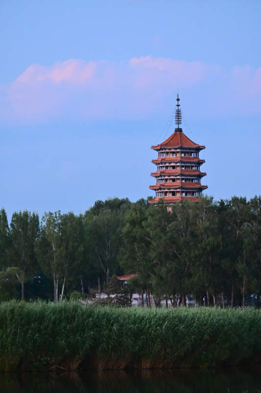 湖畔古塔映晚霞