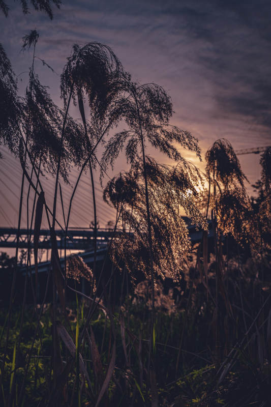 夕阳下的芦苇与桥梁