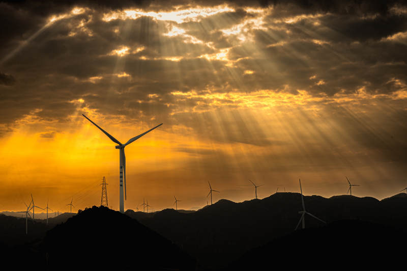 夕阳下的风车剪影