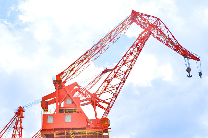 红色起重机在蓝天白云下