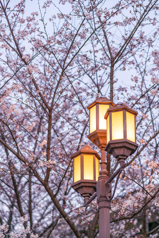 樱花树下的温暖灯光